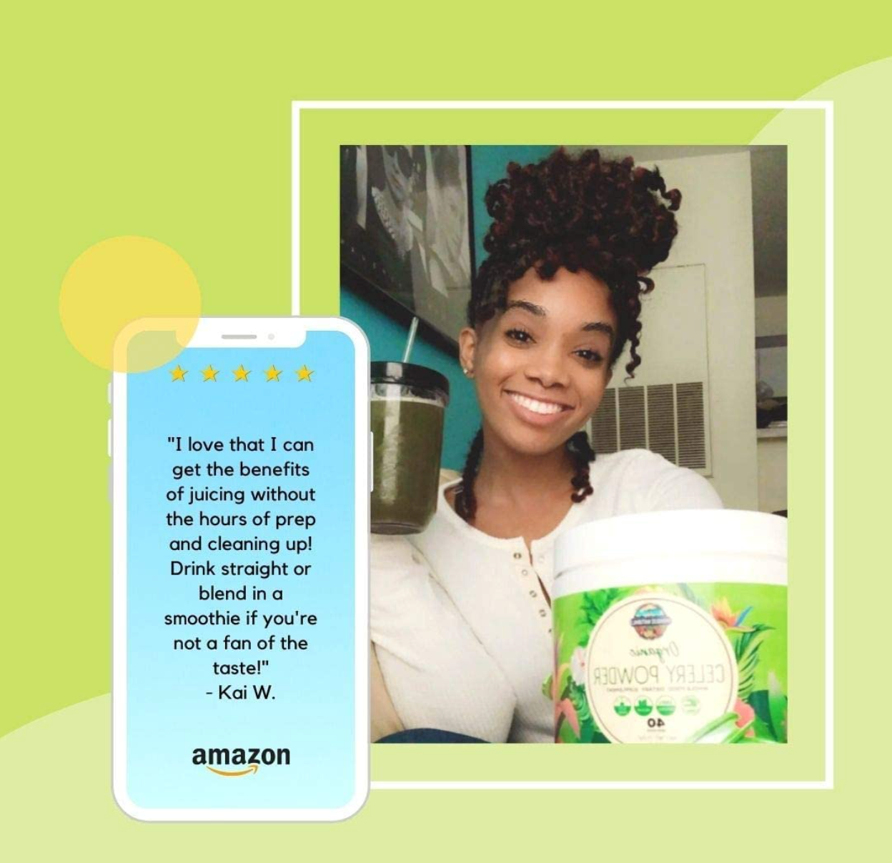 I started using celery powder to help with my digestion (especially at the start of the day so that I move forward into the day on the right foot) and also to help with inflammation (for a sore and achy back). I have to say that aside from the look and feel of this product, which is well-designed, fresh-smelling, and pretty, this is doing wonders for my body. My back feels more loose than it has in a long time, and I am able to enjoy lunch without my previous irritable stomach. Cheers and namaste!"